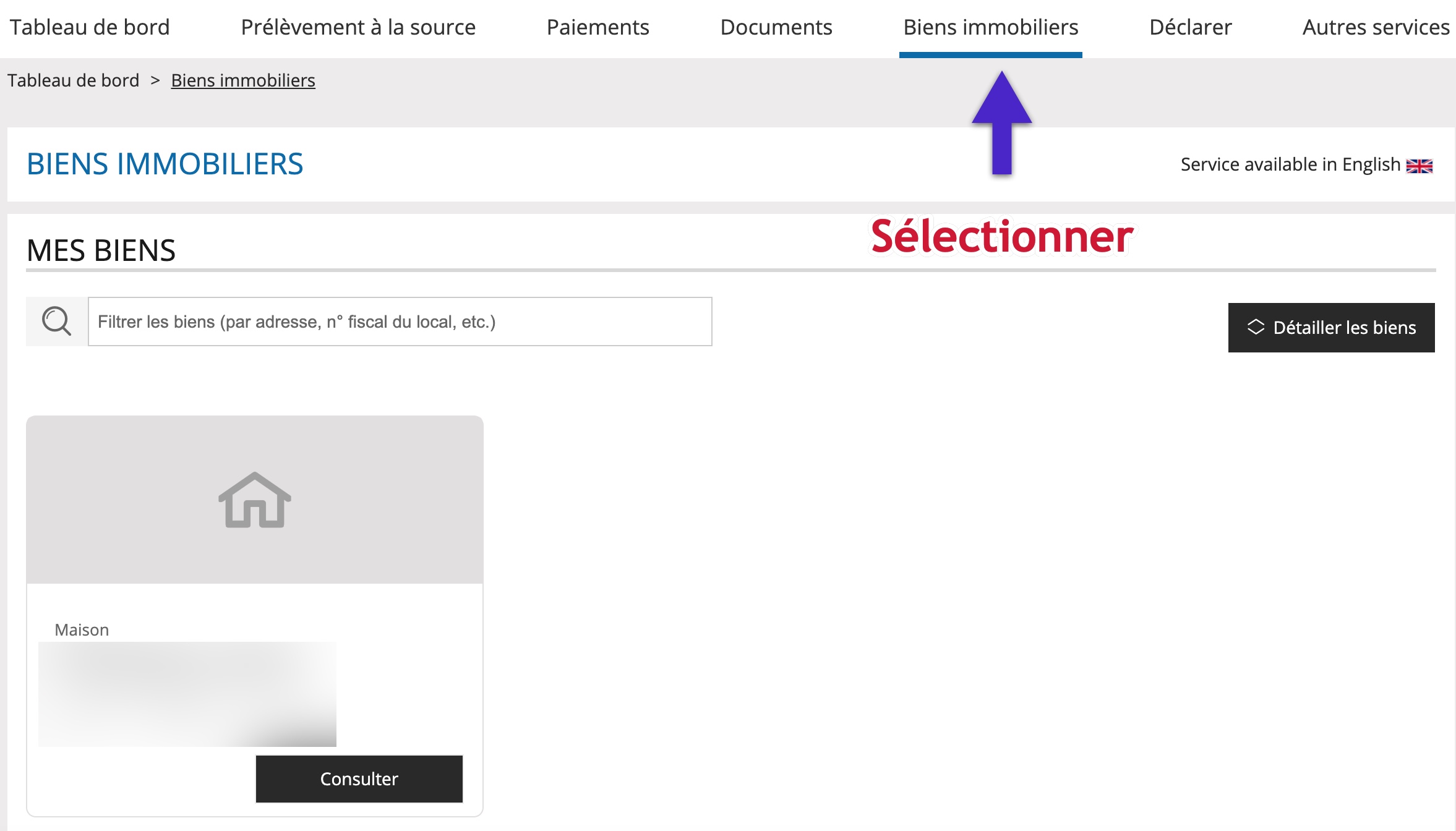 Pour accéder à l'ensemble de son patrimoine immobilier, il suffit de se connecter à son espace « Particulier » ou « Professionnel », à l'aide de ses identifiants sur impots.gouv.fr. Un onglet « Gérer mes biens immobiliers » permet d'afficher 6 biens par page indiquant pour chacun sa nature (garage, box, cave, local commercial, maison...), sa superficie et son adresse.